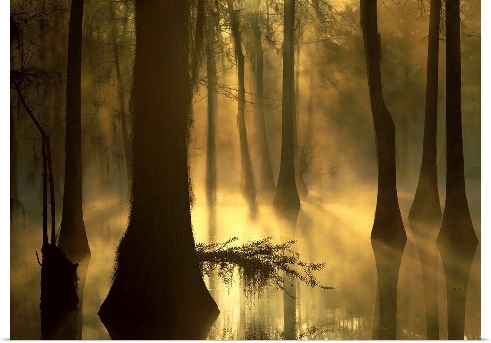 <p>Photograph of marshland with sunlight and fog peering through tall tree barks.</p>
