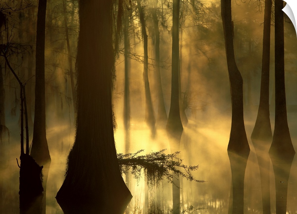 <p>Photograph of marshland with sunlight and fog peering through tall tree barks.</p>