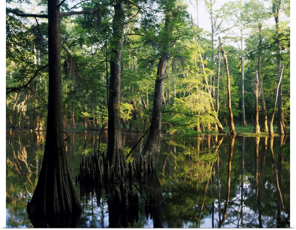 <p>Large trees are photographed as they grow from water. A line of them stand in the background.</p>