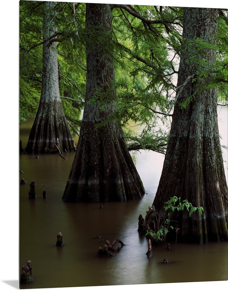 <p>Giant vertical photograph of several large cypress tree trunks with branches of green overhead, in the water of Lake Bolivar, Mississippi.</p>