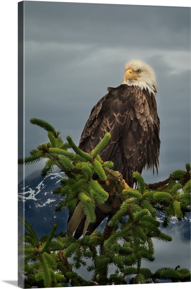 <p>Close-up of bald eagle perched on top of pine tree with snow capped mountains and stormy sky in background.</p>