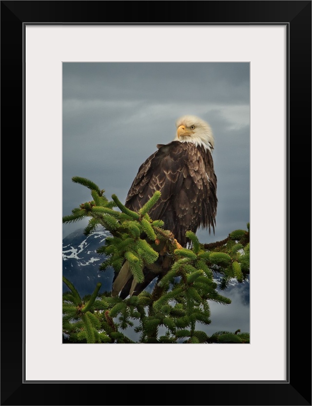 <p>Close-up of bald eagle perched on top of pine tree with snow capped mountains and stormy sky in background.</p>