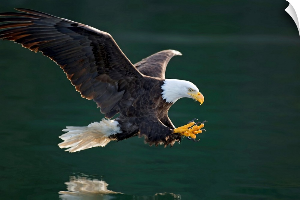 <p>Photograph of a bald eagle swooping over a body of water about to catch a fish in it claws.</p>