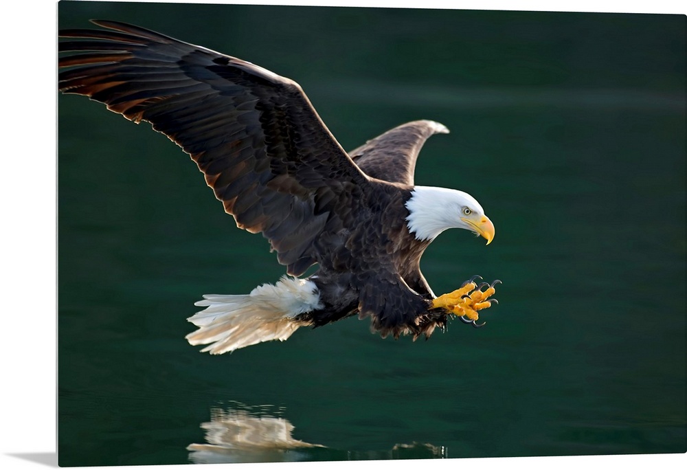 <p>Photograph of a bald eagle swooping over a body of water about to catch a fish in it claws.</p>