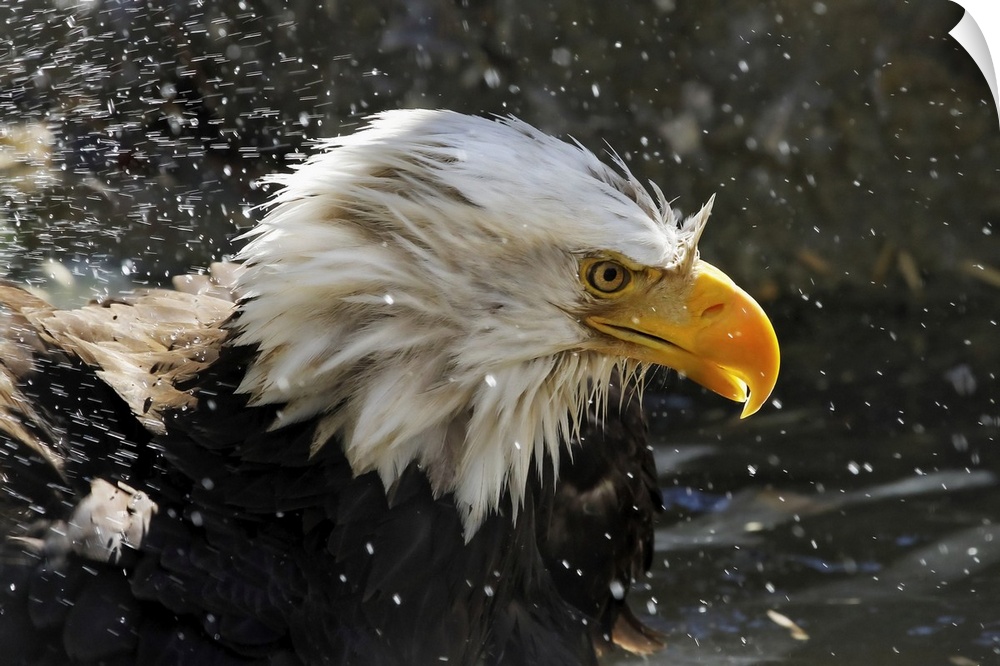 <p>Bald eagle (Haliaeetus leucocephalus) with splashes of water; Denver, Colorado, United States of America</p>