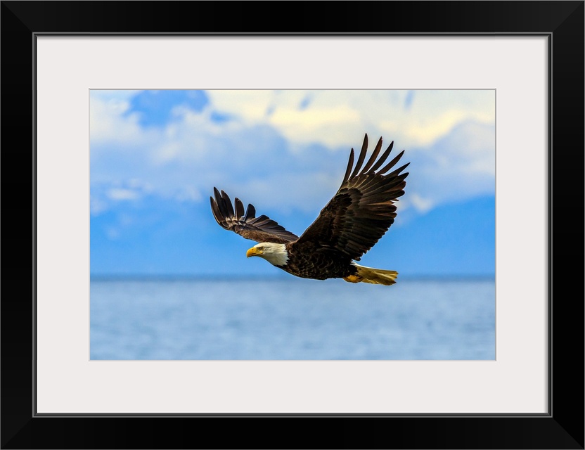 <p>Bald Eagle, Haliaeetus leucocephalus, in flight along the shoreline in Cook Inlet, Alaska.</p>