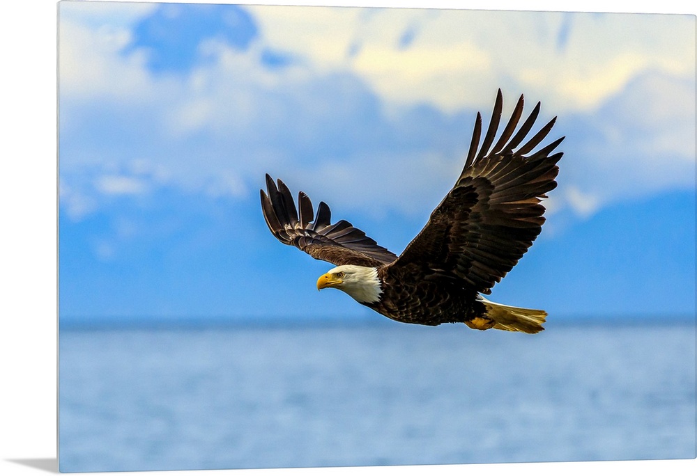 <p>Bald Eagle, Haliaeetus leucocephalus, in flight along the shoreline in Cook Inlet, Alaska.</p>