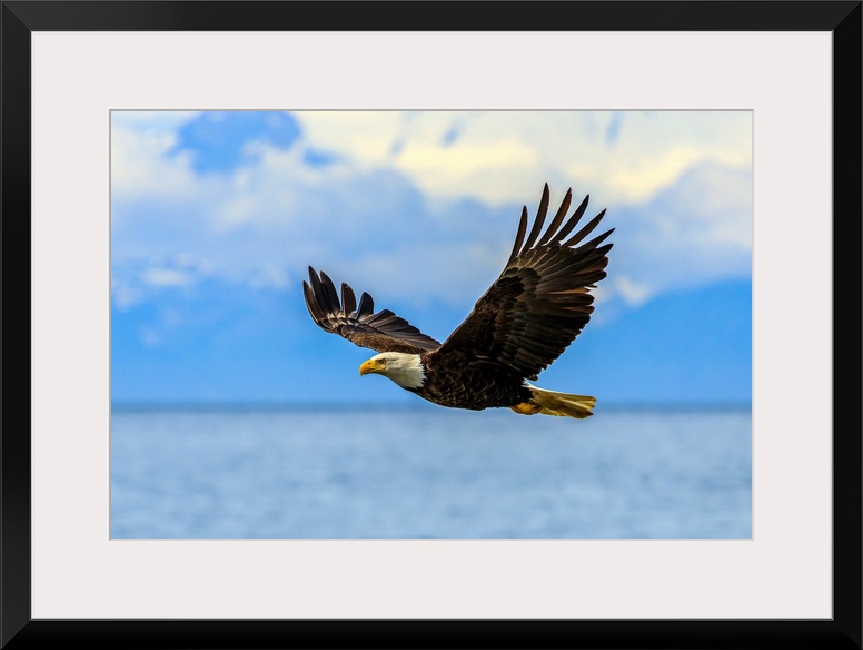 <p>Bald Eagle, Haliaeetus leucocephalus, in flight along the shoreline in Cook Inlet, Alaska.</p>