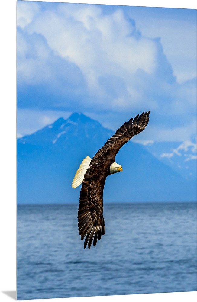 <p>Bald Eagle, Haliaeetus leucocephalus, in flight along the shoreline in Cook Inlet, Alaska.</p>