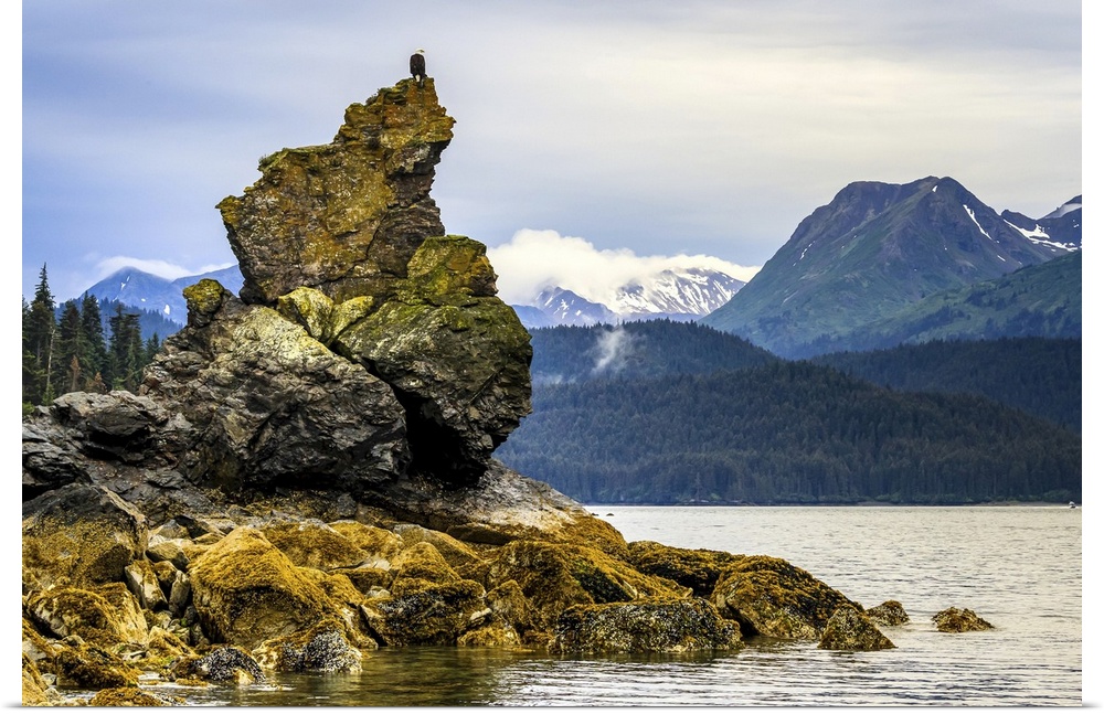 <p>Bald Eagle, Haliaeetus leucocephalus, perched on rock pinnacle in Kachemak Bay.</p>