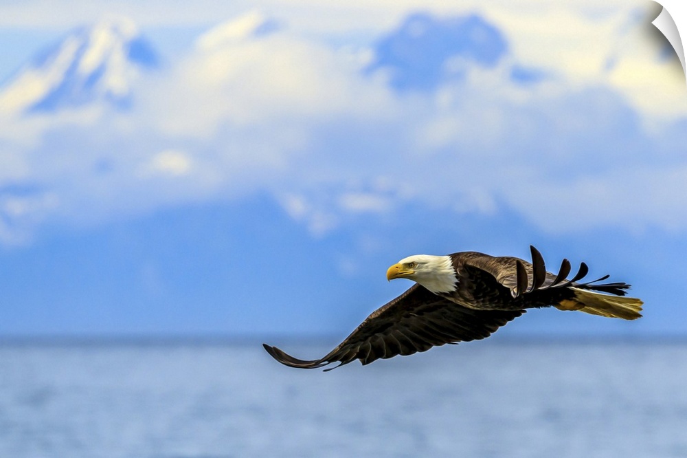 <p>Bald Eagle, Haliaeetus leucocephalus, in flight along the shoreline in Cook Inlet, Alaska.</p>