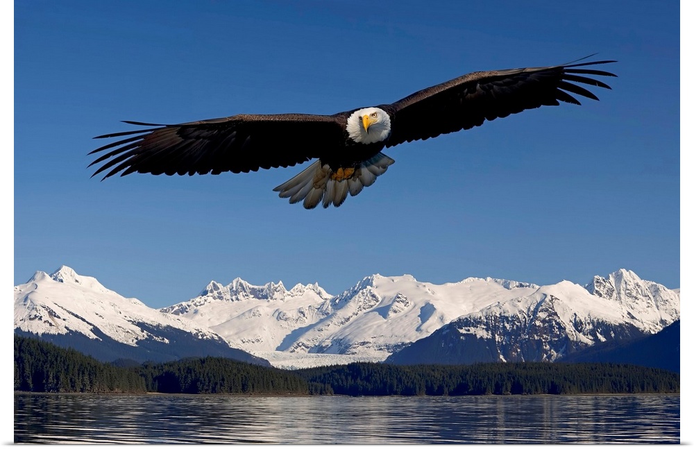 <p>Photo print of an eagle with wide wing span flying over water with snowy rugged mountains in the background.</p>