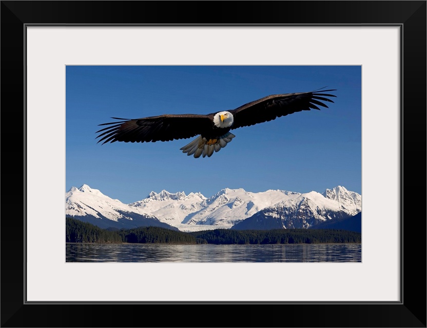 <p>Photo print of an eagle with wide wing span flying over water with snowy rugged mountains in the background.</p>