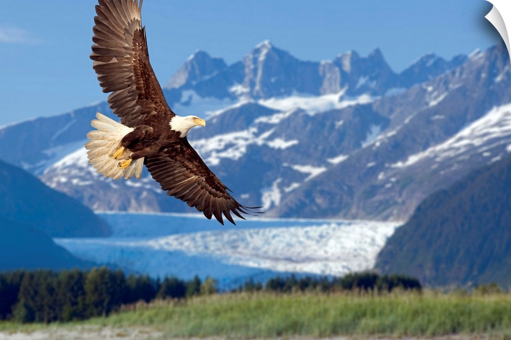<p>Large, horizontal photograph of a bald eagle in flight, in Tongass National Forest, Alaska. Snow covered Mendenhall Glacier in soft focus in the background.</p>