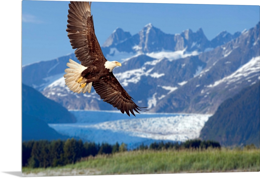 <p>Large, horizontal photograph of a bald eagle in flight, in Tongass National Forest, Alaska. Snow covered Mendenhall Glacier in soft focus in the background.</p>