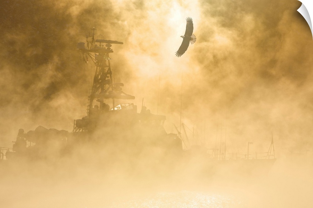 <p>Bald Eagle Soars Over Auke Bay Harbor With Ice Fog Obscuring Docked Vessel At Juneau Alaska. Composite</p>