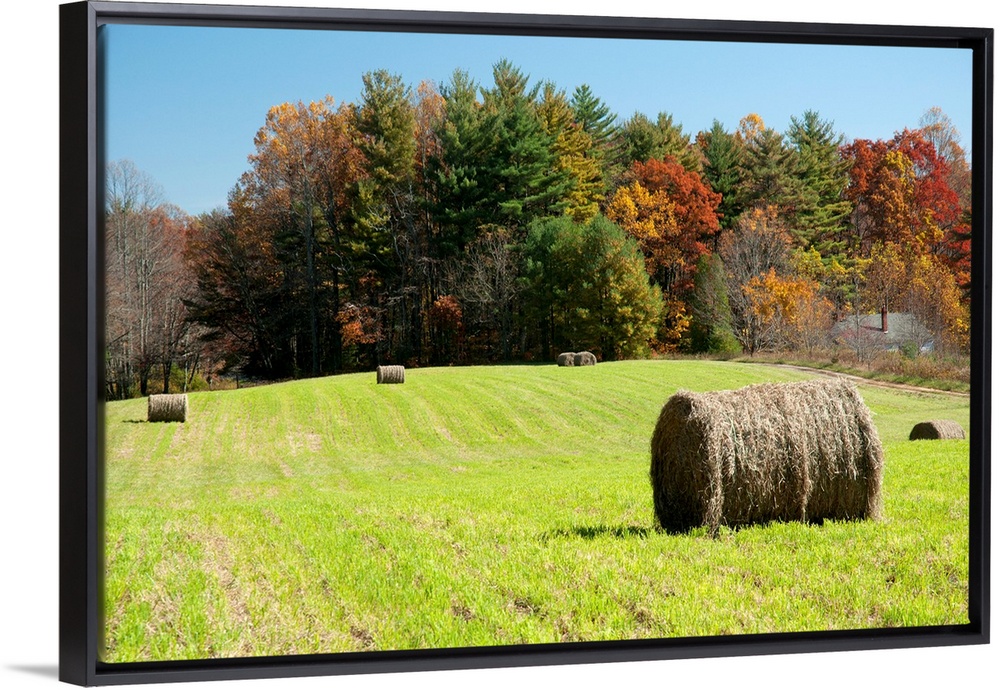 <p>Bales of hay in a field and a forest in autumn colors.</p>