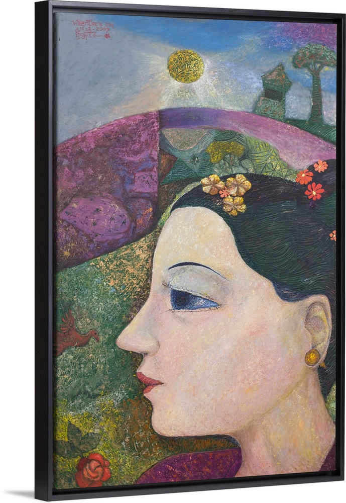 <p>Seen in profile, a beautiful girl is caressed by moonlight in a dreamlike Balinese landscape. 'With her prim hairdo adorned with beautiful flowers and her red lips, this woman's portrait looks stunning and represents the true beauty of a Balinese girl,' artist Made Surita confides. He pays tribute to the lovely woman through this radiant oil painting.</p>