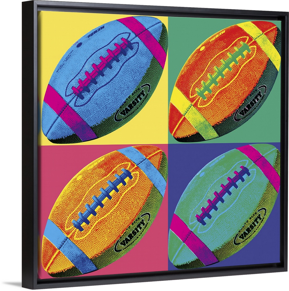 <p>A pop art style rendering of a football copied in to four multi-colored squares.</p>