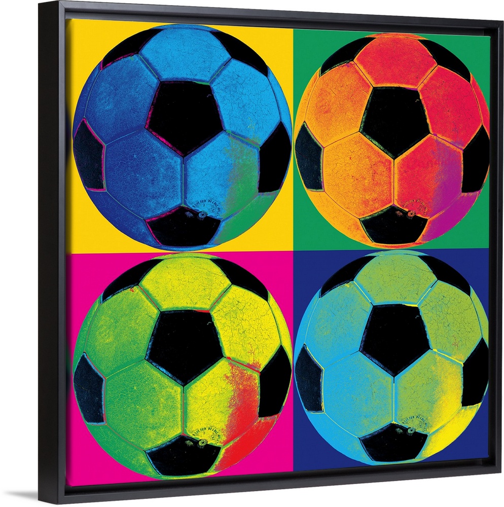 <p>A square canvas of soccer balls of various neon colors in each of the four quadrants with a different color background separating them.</p>