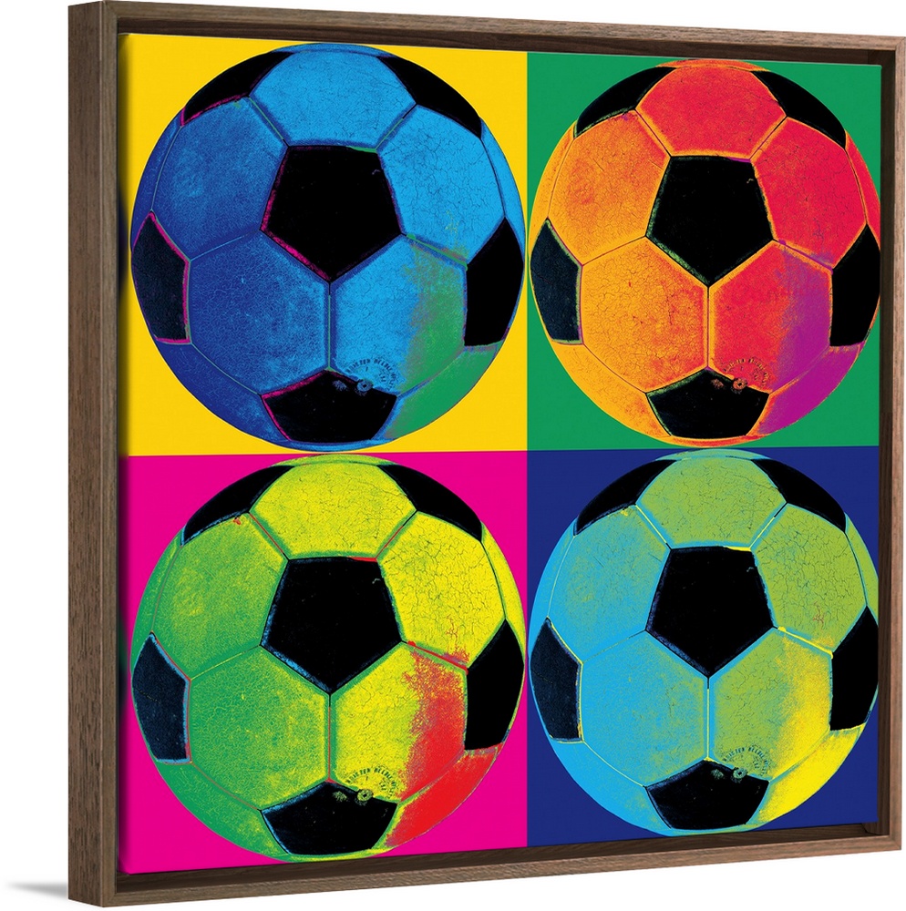 <p>A square canvas of soccer balls of various neon colors in each of the four quadrants with a different color background separating them.</p>