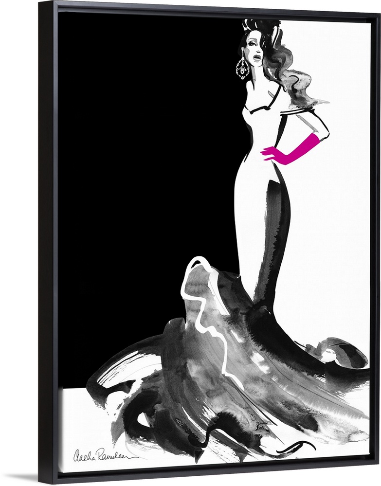 <p>Contemporary fashion artwork of a woman wearing a long dress and long pink gloves.</p>
