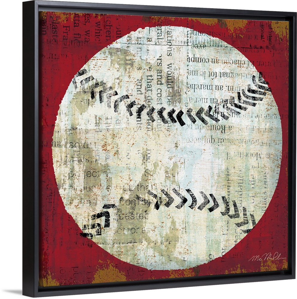 <p>Square shaped and sports themed wall art; a simplified baseball painted on top of a collage of a text.</p>
