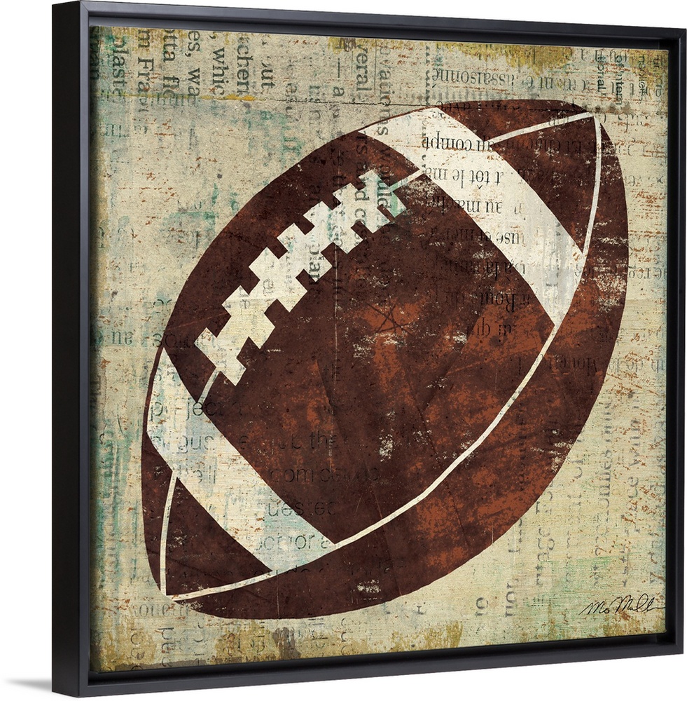 <p>Home decor wall art that is square in shape. This artwork is a simplified American football painted over a collage of text.</p>
