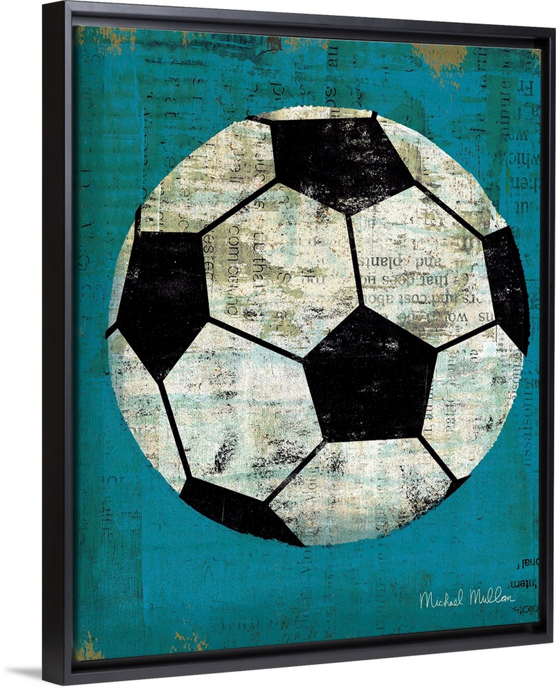 <p>Contemporary artwork of a soccer ball against a weathered blue background.</p>