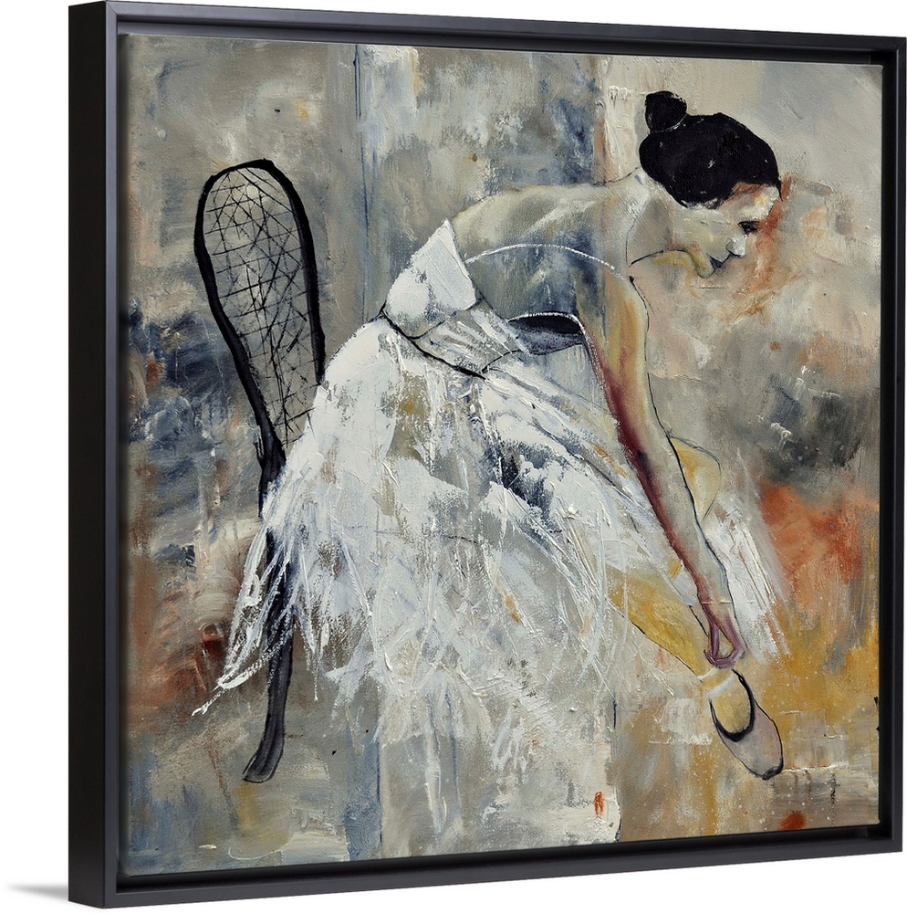 <p>Square painting of a ballerina putting on her shoes while sitting in a chair done in textured neutral paint.</p>