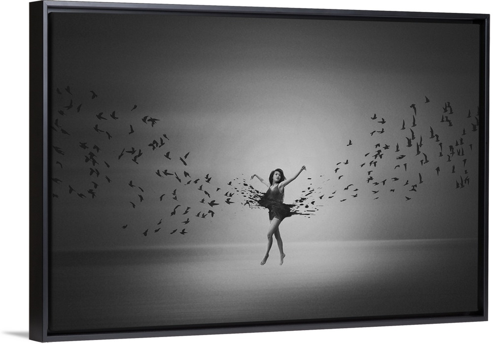 <p>A ballerina leaping as her dress transforms into birds taking flight.</p>