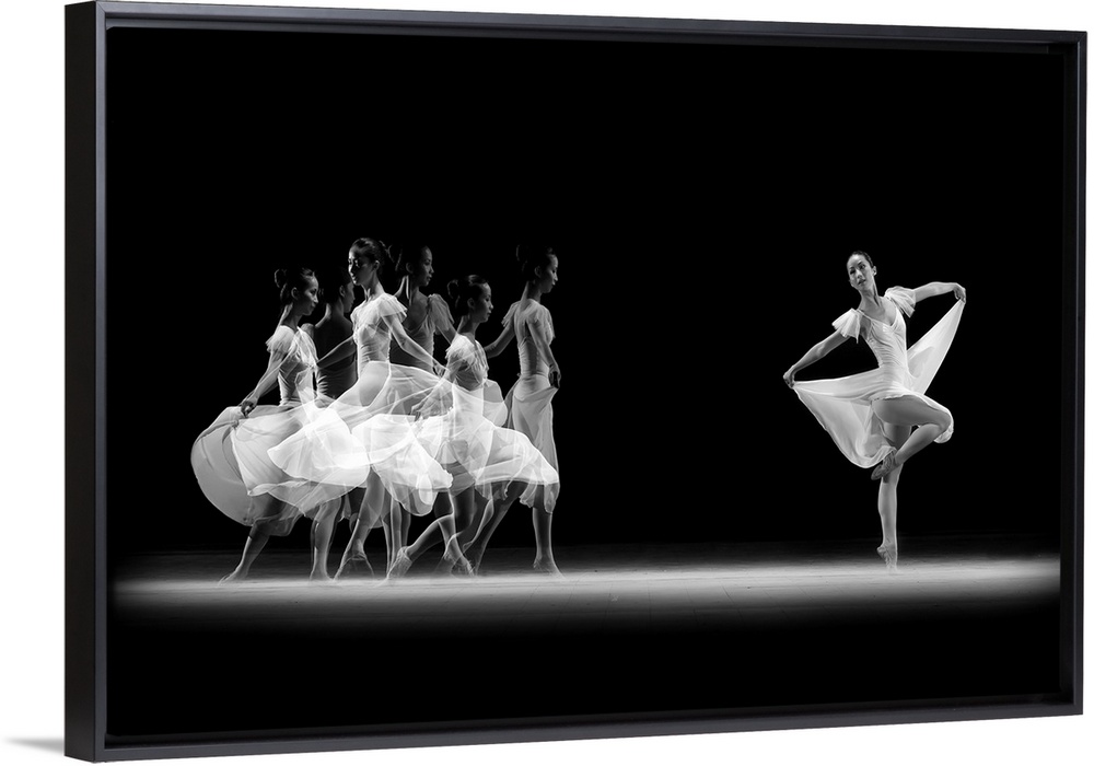 <p>Various poses of a ballerina in a white dress on a stage.</p>