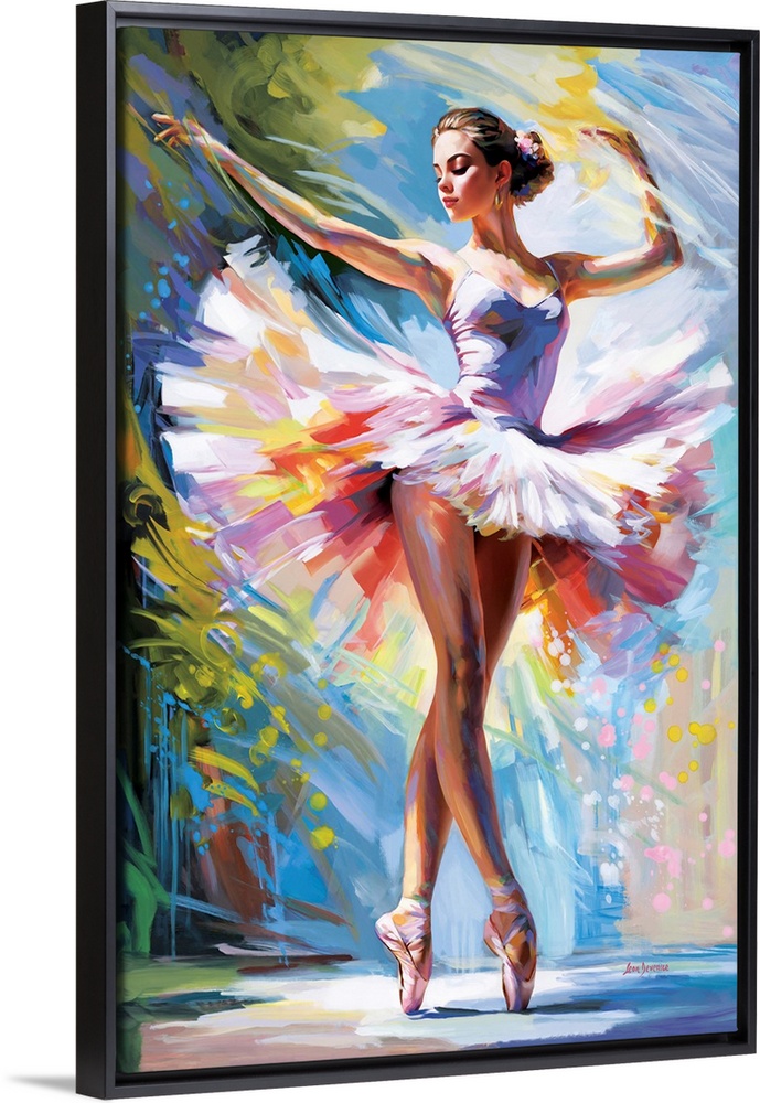<p>Colorful ballerina in a white tutu performing on pointe against a vibrant, abstract background.</p>