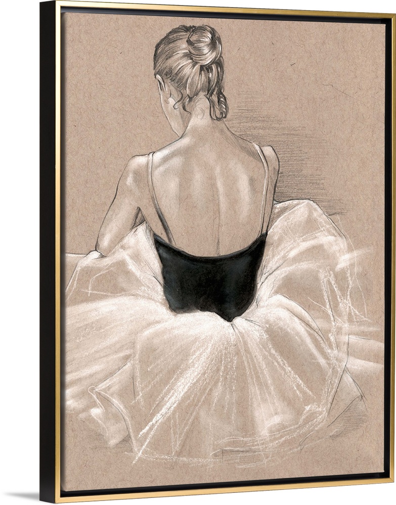 <p>Detail drawing of the back of a ballerina sitting, done in black and white on a beige background.</p>