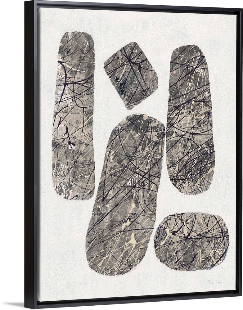 <p>Geometric abstract painting of gray oval shapes with cream, brown, and black thin line designs on top on a textured white background.</p>