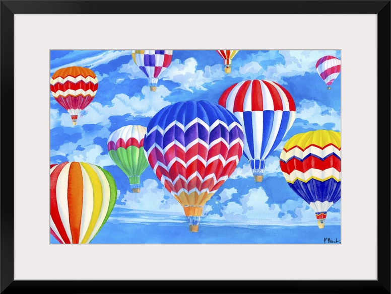 <p>Painting of a sky filled with hot air balloons with rainbow patterns.</p>