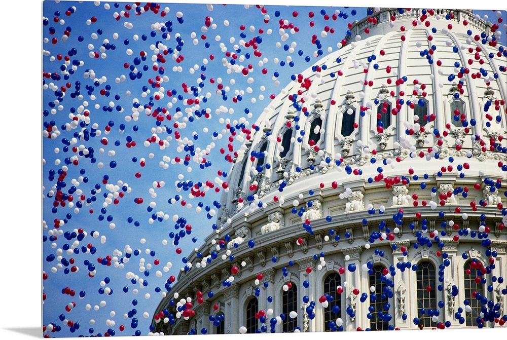 <p>Red, white, and blue balloons float over the U.S. Capitol dome in Washington, DC, in celebration of the bicentennial of the Constutition.</p>