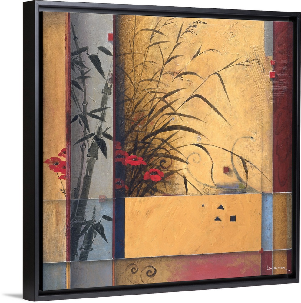 <p>A contemporary painting of bamboo and red flowers with a square grid design border.</p>