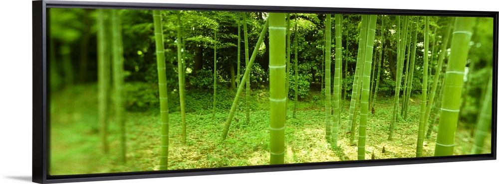 <p>Fish-eye photo of stalks of green bamboo in a Japanese forest.</p>