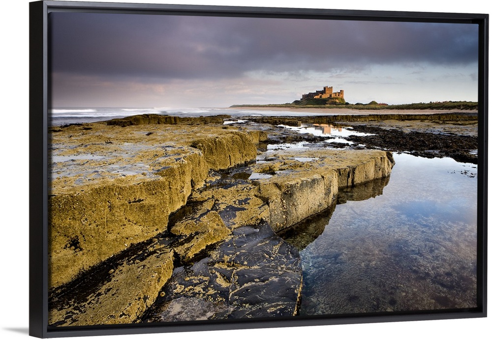 <p>Bamburgh Castle bathed in evening light with foreground of barnacle-encrusted rocks and rock pools, Bamburgh, Northumberland, England</p>