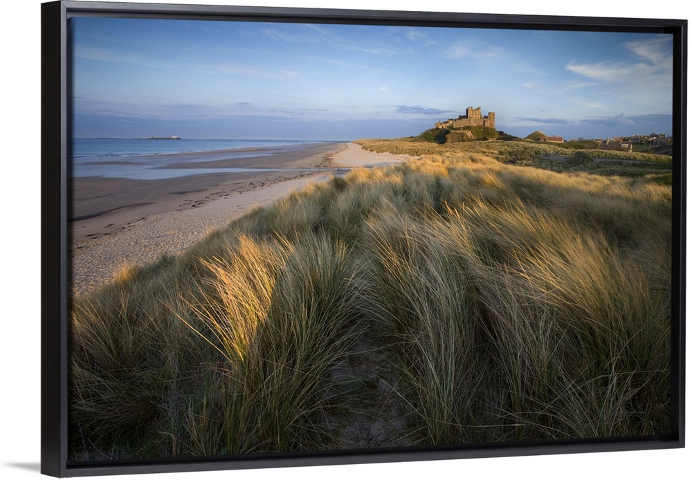 <p>Looking towards Bamburgh Castle bathed in evening light from the dunes above Bamburgh Beach, Bamburgh, Northumberland, England</p>