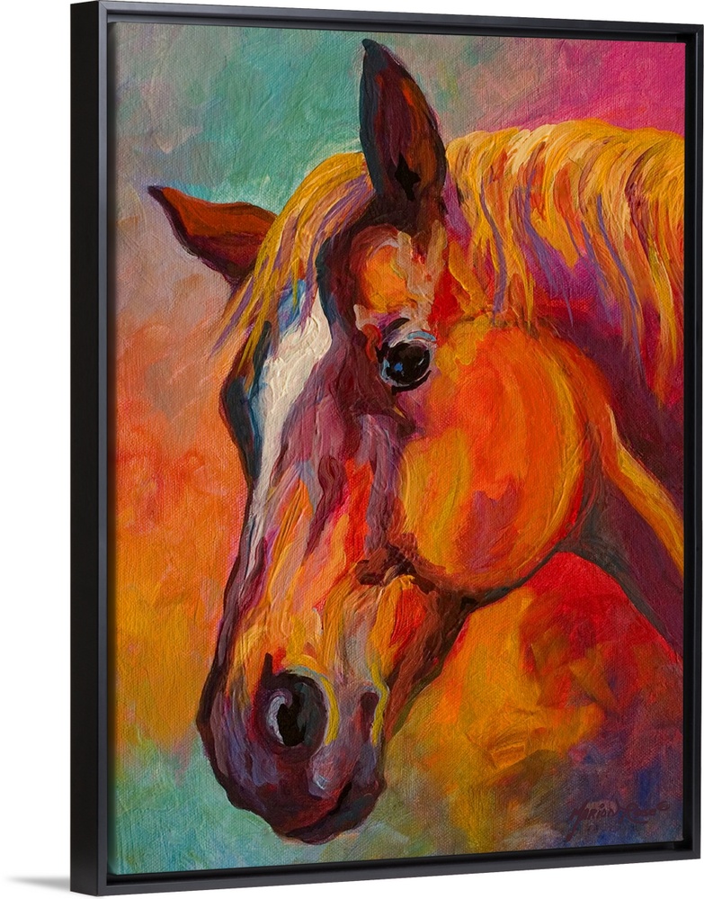 <p>Large, portrait painting of the profile of a horses face. Painted using thick, heavy brushstrokes and vibrant, warm colors. The background is a transition in rainbow-like colors.</p>