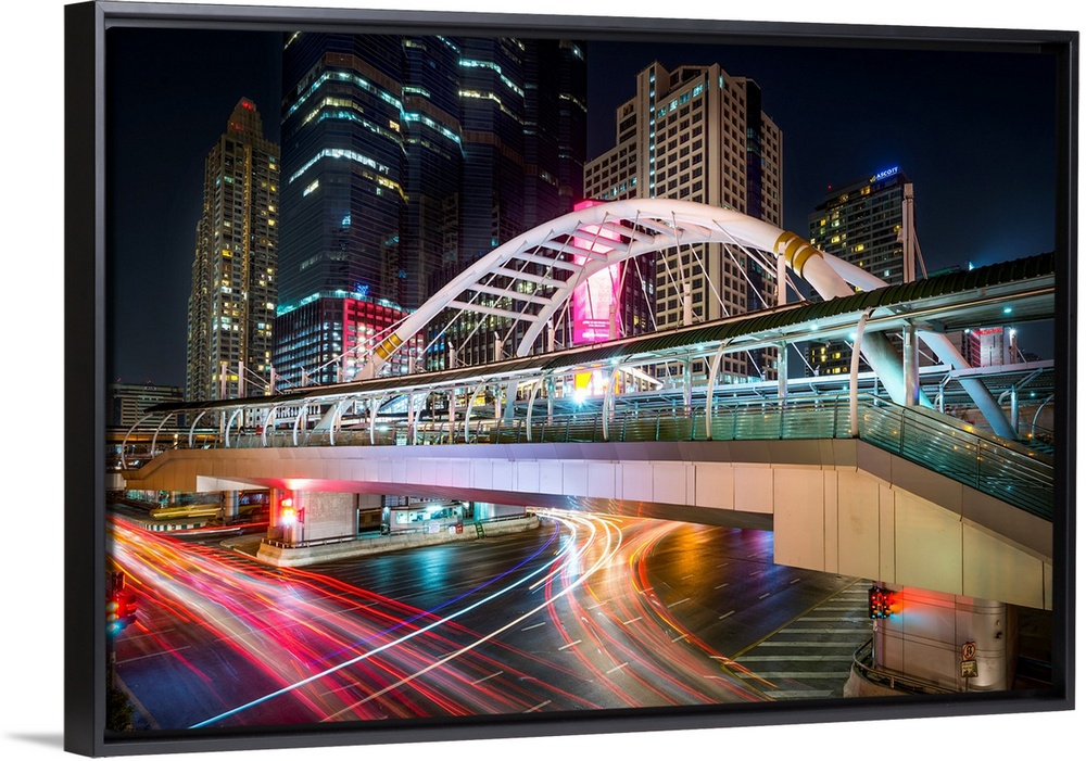 <p>Pedestrian bridgein Bangkok, Thailand, illuminated at night from light trails in the city.</p>