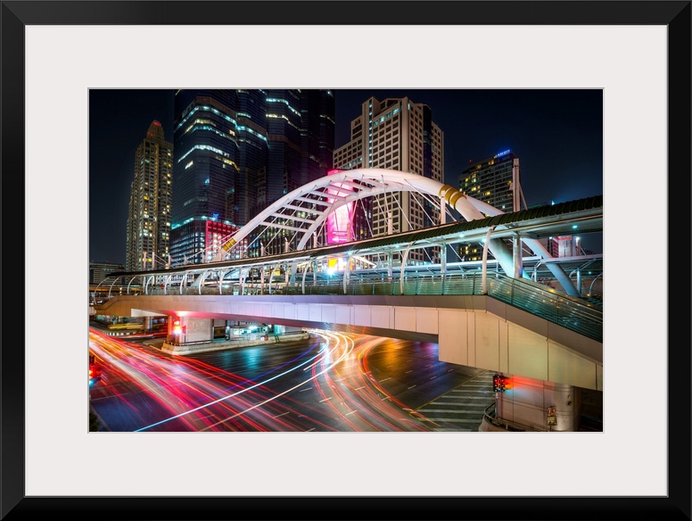 <p>Pedestrian bridgein Bangkok, Thailand, illuminated at night from light trails in the city.</p>