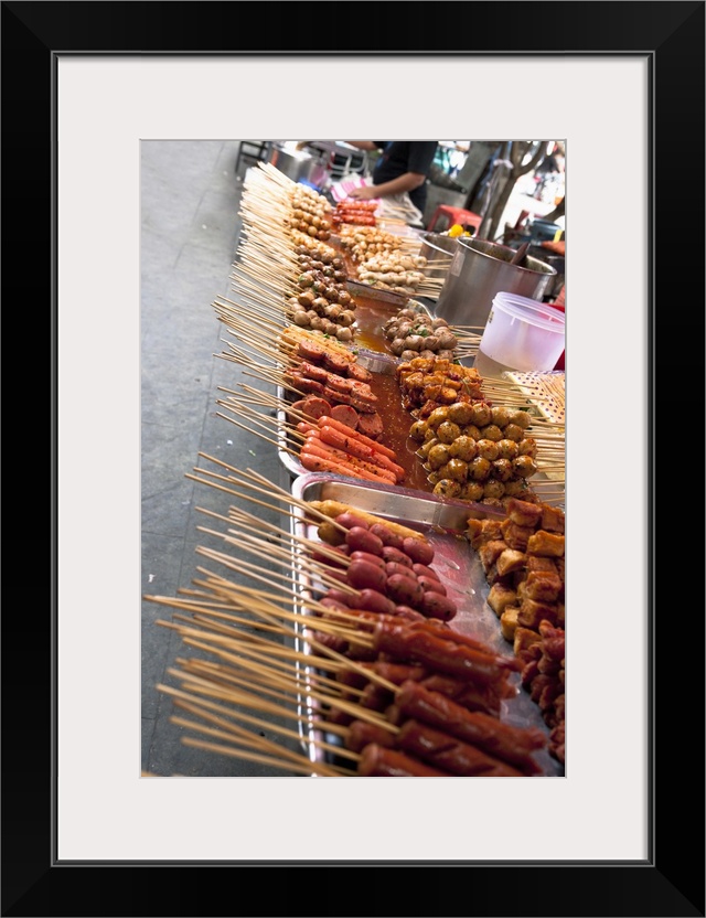 <p>Bangkok, Thailand - Tilted view of a street vendor selling various Thai foods on wood skewers. Vertical shot.</p>