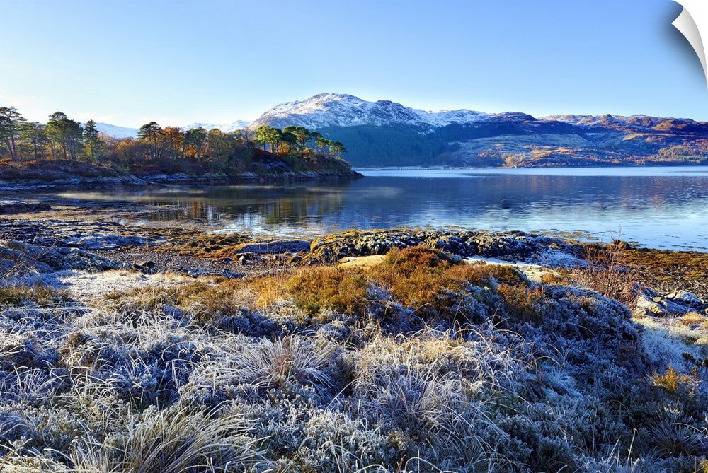 <p>Winter view on a frosty sunny morning along the banks of Loch Sunart in the Ardnamurchan Peninsula, the Scottish Highlands, Scotland, United Kingdom, Europe</p>
