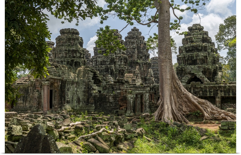 <p>Fallen rocks and trees behind ruined temple, Banteay Kdei, Angkor Wat; Siem Reap, Siem Reap Province, Cambodia</p>