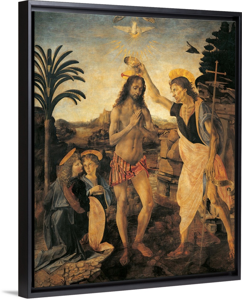 <p>The Baptism of Christ, by Andrea Verrocchio, Leonardo da Vinci, 1475 - 1478, 15th Century, oil and tempera on panel, cm 177 x 151 - Italy, Tuscany, Florence, Uffizi Gallery. Painted mainly by Verrocchio. Leonardo depicted the angel. All. Christ baptized b</p>