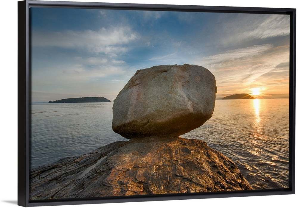 <p>A large rock on the beach in Acadia National Park in Maine, with the sun rising in the distance.</p>