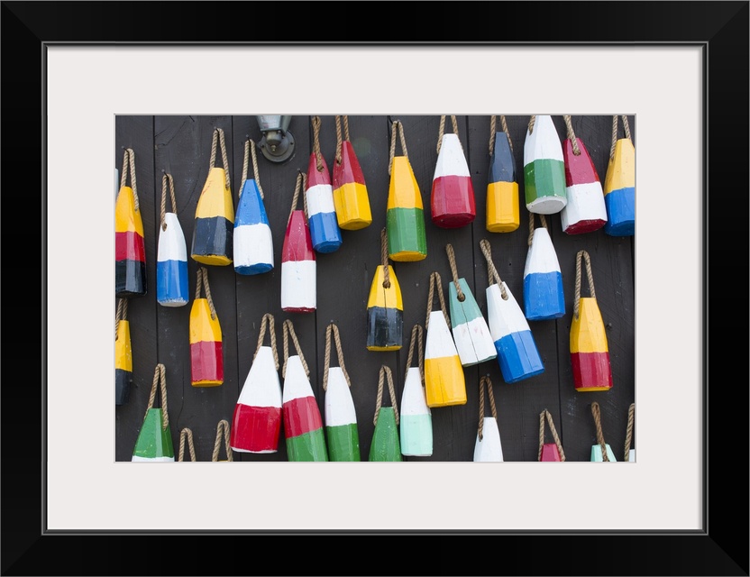 <p>Bar Harbor Maine colorful buoys on wall for sale and state specialty souvenirs for lobster traps catching fishing</p>
